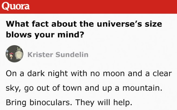 Recently, a man named Krister Sundelin took to Quora to answer the question “what fact about the universe’s size blows your mind?”