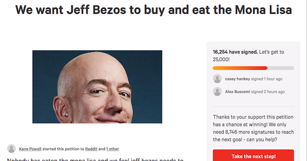 A petition for Jeff Bezos to buy and eat the Mona Lisa is gaining steam at over 16K signatures