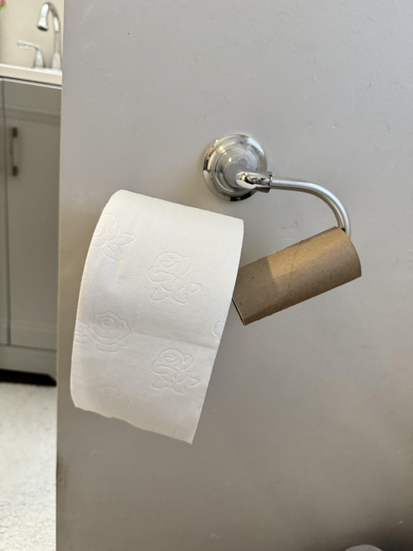 My fiancé never changes the toilet paper when he finishes the roll, so I decided to do the same this time. This is what I saw when I went to the bathroom the next time.