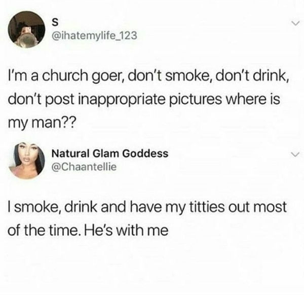 Those guys suck. But there are plenty of women out there who act the same way. Introducing the ‘nice girl.’ She’s mean. She’s manipulative. And she’s single because ALL MEN ARE SHALLOW PIGS WHO JUST WANT SEX. Like the nice guy, her singledom is in no way a fault of her own. And the worst part about the nice girl is she writes off her own toxic behavior as cute and quirky — “I just had a crazy moment… oopsie.” Scroll through to see what I mean. And if you’re involved with a woman like this… run. Run far away and never look back.