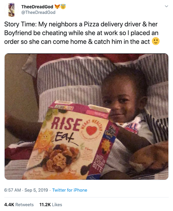 If there’s one thing we learned from Twitter user TheeDreadGod’s crazy story about catching his cheating neighbour in the act, it’s that you don’t play with his food or his sleep… you’ll understand soon.