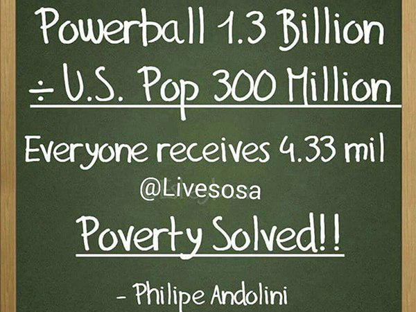Now a meme has been circulating on Facebook which declares that whoever wins the jackpot could actually “solve US poverty” by splitting the $1.5 billion with the rest of the U.S. population. According to math, the meme-creator claimed that, with roughly 300 million people in the country, sharing the money would give every person $4.33 million. Sadly, people often believe what they want to hear.