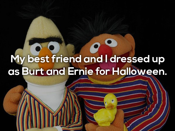 My best friend and I dressed up as Burt and Ernie for Halloween about 8 years ago. Went out and got pretty hammered at the bars, and then I see down the street, Cookie Monster, just standing there. Well I thought it was a good idea to jump on his back, we both fell to the ground, and that’s when I feel a shot to the side of my face. I look up and I see Elmo and he is reigning blows down upon me and he is piiiiissed. As he’s winding up to take another swing, I see Burt fly in and spear him. We ended up tussling with them for about 10 seconds, landed a few blows to them before they finally realized that the whole thing was supposed to be a joke and they finally stopped struggling. -@Chapulin