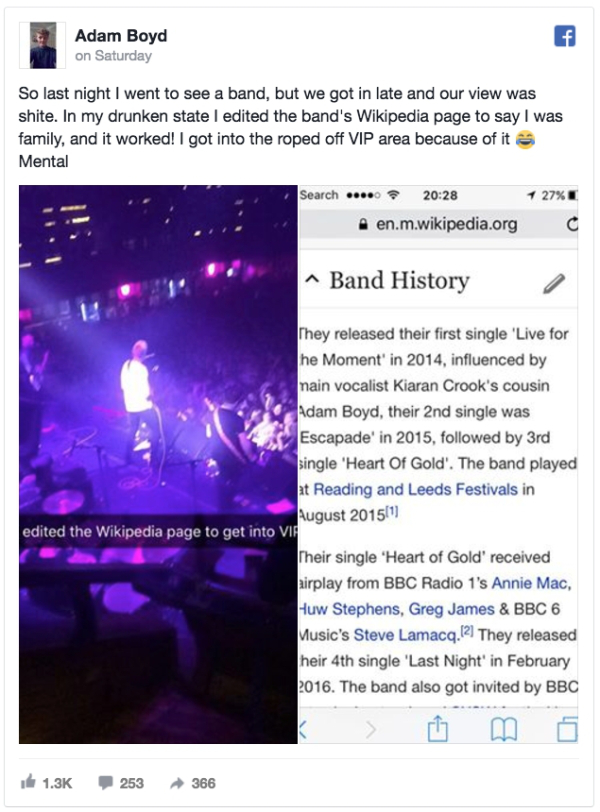“So last night I went to see a band, but we got in late and our view was shite. In my drunken state, I edited the band’s Wikipedia page to say I was family, and it worked! I got into the roped off VIP area because of it 😂 Mental,” Boyd wrote on Facebook.