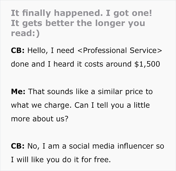 Now I’m no social media guru, but calling yourself an “Influencer” when you have a measly 1,200 followers is a bit of a reach. And it sure as hell isn’t worth $1,500.