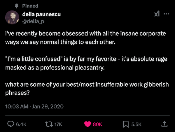 humor 2811 Liked! 9 Disliked 0 Passive-Aggressive Work Phrases For Your Next Angry E-mail (34 Photos) by: Laura Lee In: Humor, Life Hacks, Owned, Too True, Tweets, Winning, Work Sucks Jan 8, 2025 2811 Liked! 9 Disliked 0 1 @delia_p This tweet asked for the best/most insufferable gibberish work phrases, and the responses are so true it hurts. What are some passive-aggressive corporate code words that make you want to three-hole punch your coworkers? Sound off in the comments! Like this post? 2811 Liked! 9 Disliked 0
