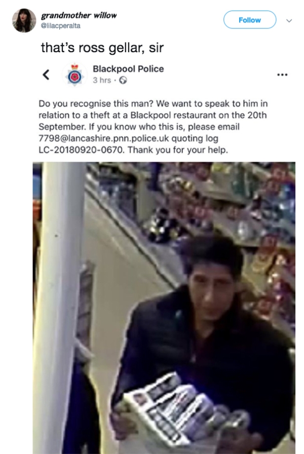 Police in Blackpool, England, put out an appeal for information on a man accused of stealing beer from a store. Many have pointed out that the suspect looks strangely like David Schwimmer, who played Ross in ‘Friends.’
