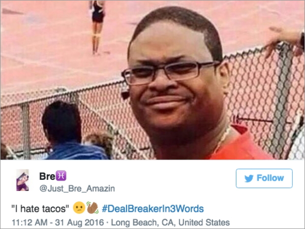 No relationship is easy, but some romances are doomed from the very beginning. The trending Twitter page #DealBreakerIn3Words has people distilling what will railroad the chances of a relationship before it ever gets off the ground.