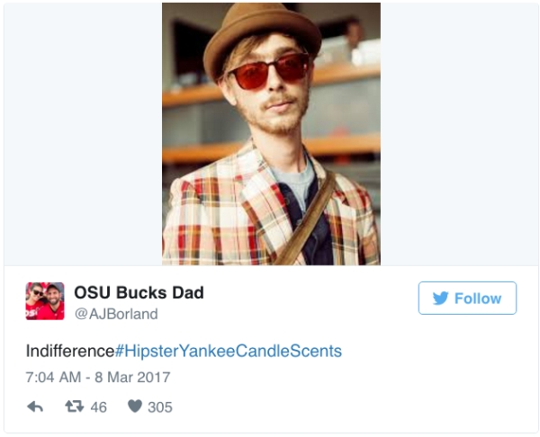 As an Austin resident myself, I see my share of hipsters traipsing around the streets in their skinny jeans, beanie hats, sporting slicked hair and an old-timey mustache. So when I first found out that there was a Twitter hashtag #HipsterYankeeCandleScents I had a good laugh knowing that despite the page being satirical, odds are there is an army of people out there who actually wish these candle scents really existed. True or not, these candle names really hit the hipster core ethos right on the head.