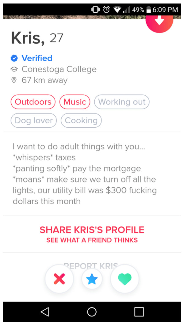 humor 0 Liked! 0 Disliked 0 The wild and unpredictable world of Tinder (25 photos) by: Staff In: Funny Pictures, Genius or Stupid, Humor Jan 22, 2021 0 Liked! 0 Disliked 0 1 Like this post? 0 Liked! 0 Disliked 0