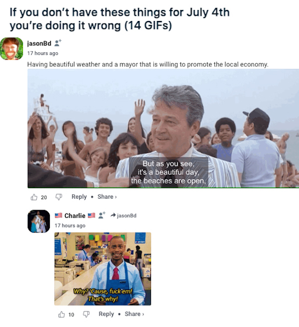 humor 201 Liked! 15 Disliked 0 Top Comments that’ll make any patriotic misfit proud this holiday weekend!! (80 Photos) by: Bob In: Awesome, Chive Nation, Funny Pictures, Humor, Top Photos Jul 2, 2023 201 Liked! 15 Disliked 0 1 Happy 4th of July Weekend!! If you are lucky you will get a nice longggg weekend out of the upcoming holiday. And nothing washes down a perfect long weekend quite like sipping a beer and scrolling through some uber-silly comments! Enjoy the best of YOUR own work! Like this post? 201 Liked! 15 Disliked 0