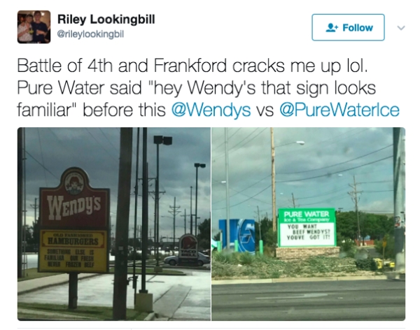 Soon after, Wendy’s apparently hopped on the bandwagon as well, and offered Kingsbury free food and drink. Pure Water called them out for the all-too-familiar sign. Wendy’s clapped back, “Something else that’s familiar is our never frozen, fresh beef.”