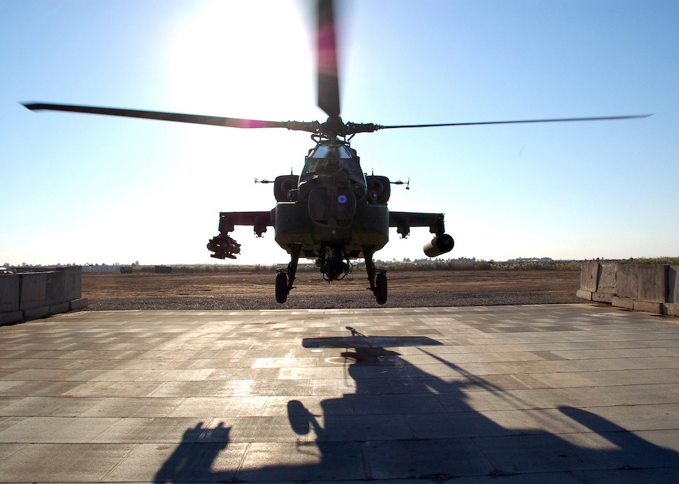 An AH-64 Apache helicopter from the 227th Attack Reconnaissance Battalion, 1st Air Cavalry Brigade, 1st Cavalry Division, takes off from Forward Operating Base Kalsu, Iraq, to provide close air support for a mission being conducted by paratroopers in the 4th Brigade Combat Team (Airborne), 25th Infantry Division(U.S. Army photo by Warrant Officer Richard Reed, 25th Infantry Division Public Affairs)