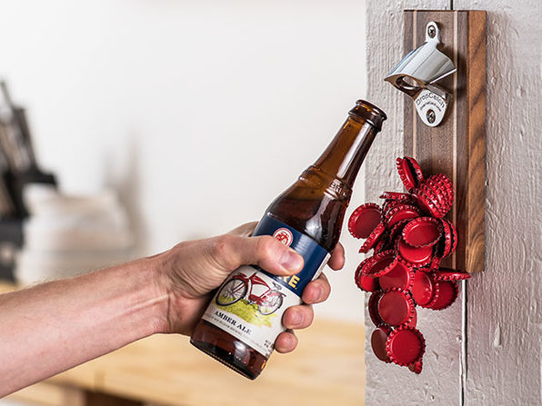 Designed from quartersawn walnut wood, flanked by two maple inlays, and finished with lacquer. The Pilsner Bottle Opener opens all bottle types and will be a great gift for the beer buff in your life. It can be magnetically mounted or wall mounted. The standard bottle opener holds over 40 bottle caps. Each bottle opener is handcrafted to last generations to come. You can customize the wood with a 3-character engraving or a 12-character engraving. Get this decorative and functional bottle opener and have a beer party whenever you want!