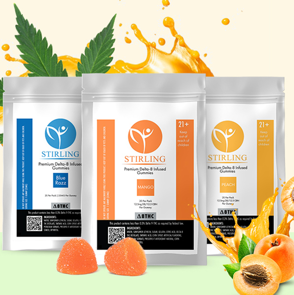 Stirling’s Delta 8 Gummies come in 3 Tasty Flavors – Blue Razz, Mango, and Peach. Pick and choose any 3 packs and get all three for $79.99!